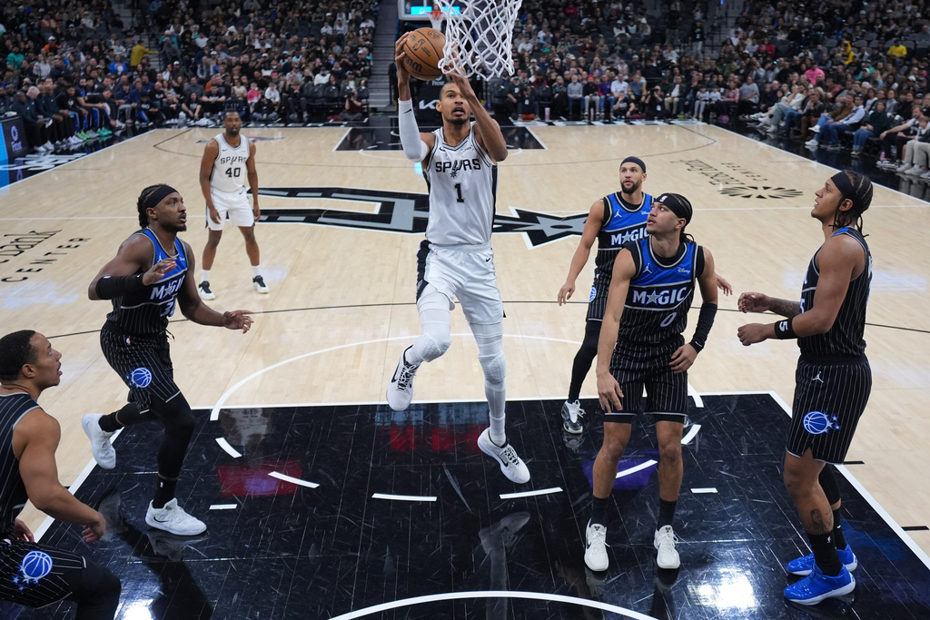 SAN ANTONIO (AP) — Victor Wembanyama tuvo 25 puntos, ocho rebotes y cinco bloqueos, y San Antonio venció 112-103 al Magic de Orlando el domingo por la noche en un partido que comenzó cinco horas tarde debido a los problemas de viaje de los Spurs.